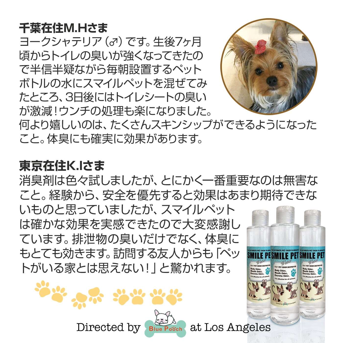 犬の場合は人間の約100万倍、猫の場合は人間の数万倍から数十万倍の臭覚を持っているといわれています。このため、人間にはかすかなニオイでも、可愛いペットにはとてもきついニオイと感じているかも知れません。スマイルペットは100%天然植物成分によってつくられた無色透明、無味無臭のペット用消臭液です。どのペットにも安心・安全にご使用いただけます。