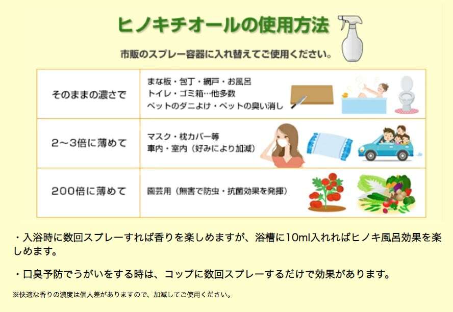水に溶かして使っても良いのだと思いますが、それだと使いきれないくらいのヒノキチオール水ができますね。