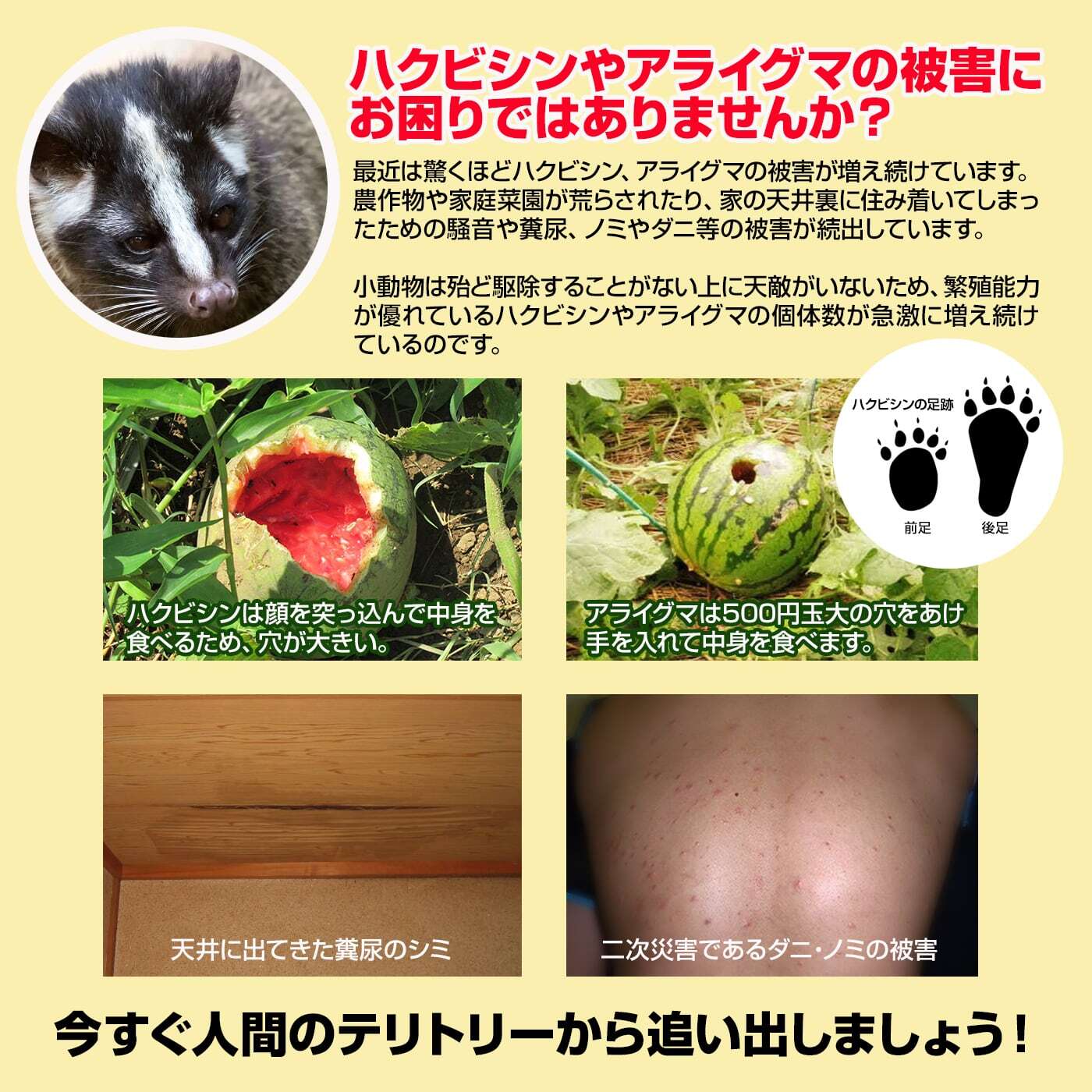 ハクビシン以外のアライグマ、タヌキ、アナグマ、猿などにも効果が実証されていますが、屋外の場合は風向きも関係しますので数を増やすなどの工夫が必要です。また、非常に頭の良い猿などには設置数を考え、侵入口、通り道などに設置する等の工夫をしながら撃退してください。