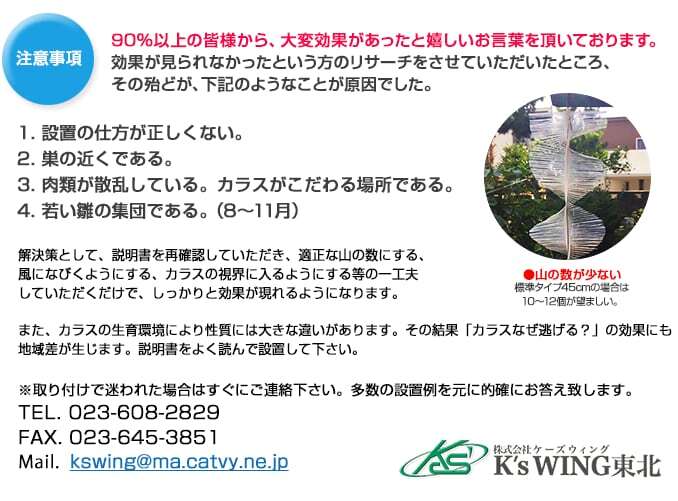 ※カラスの生育環境により性質には大きな違いがあります。その結果「カラスなぜ逃げる?」の効果にも地域差が生じます。説明書をよく読んで設置して下さい。