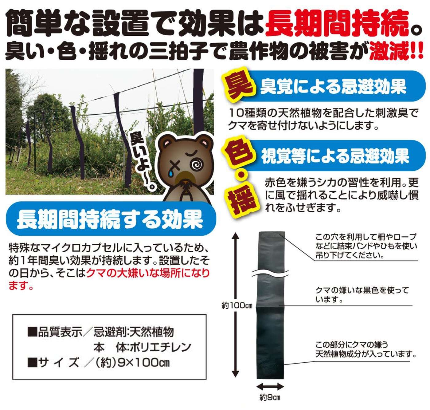 長期間効果が持続!特殊な微細マイクロカプセルに入っているため、約1年間効果が持続します。設置したその日から、そこは熊の大嫌いな場所になります。