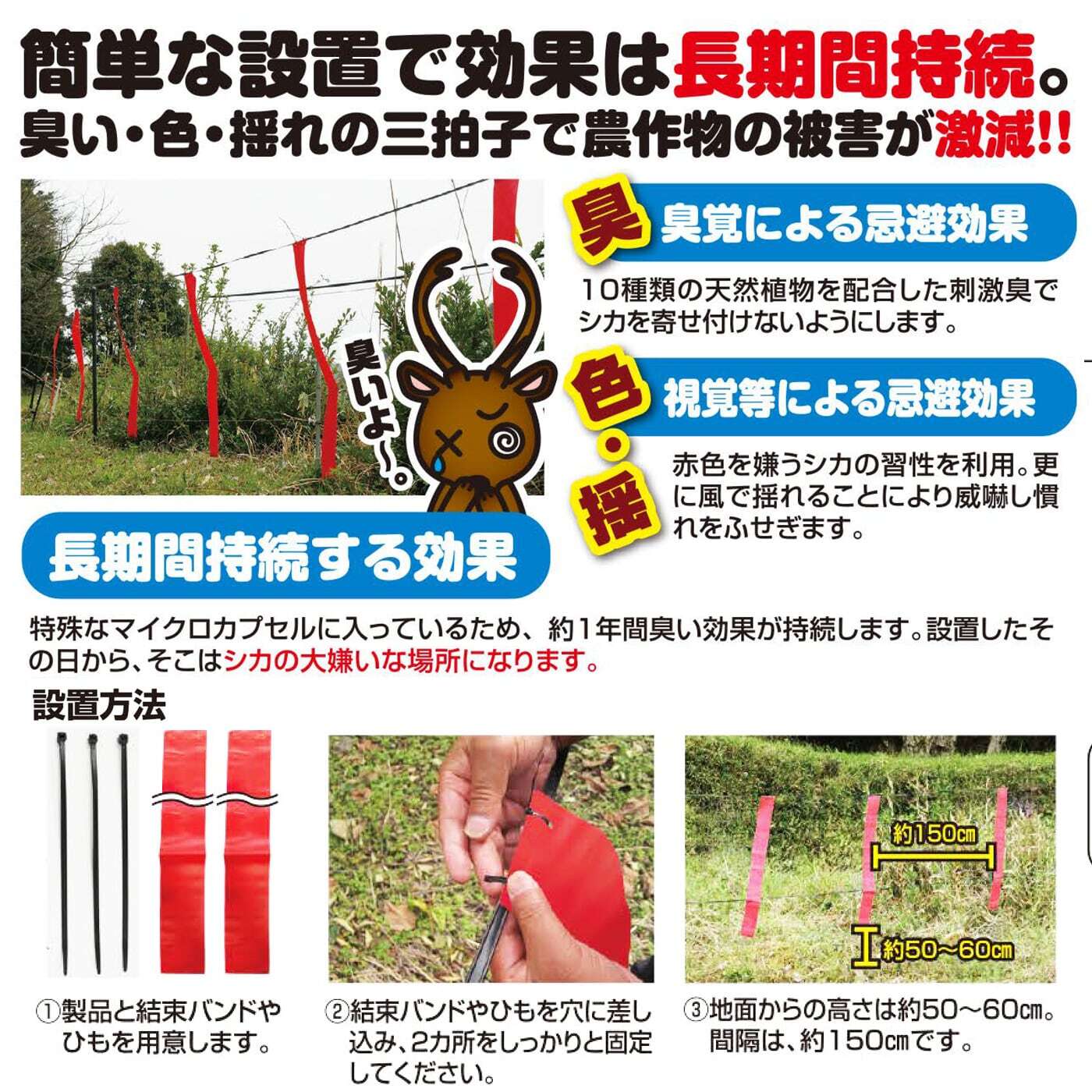 長期間効果が持続!特殊な微細マイクロカプセルに入っているため、約1年間効果が持続します。設置したその日から、そこはシカの大嫌いな場所になります。